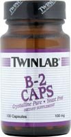 B-2 100mg by Twinlab Inc 100 Capsule B-2 100mg 100 Capsule How It Works Well tolerated by most individuals. No tablet binders coatings or colorings added. No added flavoring salt artificial sweeteners colorings preservatives or salicylates. Easy to Swallow and Assimilate Crystalline Pure No Yeast Added Suggested Use As a dietary supplement Take one capsule daily. Product Specs Size Count 100 Form Capsule Or as directed by your healthcare professional. Supplement Facts Serving Size 1 Capsule Amount Per Serving Daily Value Riboflavin (as riboflavin 5' phosphate sodium riboflavin) 100 mg 5882 Percent Daily Values are based on a 2 000 calorie diet Other Ingredients Gelatin potato starch Purified water magnesium stearate medium chain triglycerides. Warnings Keep out of reach of children. As with all dietary supplements consult your healthcare professional before use. See product label for more information.