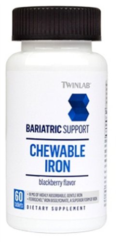 18 mg 100% of the Daily Value of highly absorbable, gentle iron Not associated with constipation or gastric upset often experienced with other iron forms No artificial flavors or sweetenersHow It Works: Iron deficiency is one of the most common nutritional concerns after bariatric surgery. Estimates indicate that up to 50% of bariatric surgery patients experience iron deficiency due to a number of factors that may include reduced absorption of iron and a decreased intake of meat.Twinlab Bariatric Support Chewable Iron is a highly absorbable iron supplement formulated to help bariatric surgery patients meet their daily iron requirements in a tasty and convenient chewable tablet. This product contains Ferrochel iron bisglycinate, a unique form of chelated iron formulated for maximum absorption without gastrointestinal irritation or the constipating effects that often accompany iron supplementation. Studies have shown that Ferrochel is both better tolerated and more readily adsorbed than ferrous sulfate which is found in some other iron containing supplements making it an ideal iron form for bariatric surgery patients.