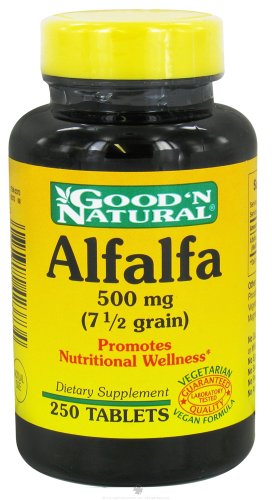 Good 'N Natural - Alfalfa 500 mg. - 250 Tablets Good 'N Natural Alfalfa is widely grown in western Asia and the eastern Mediterranean region. Traditionally, it has been brewed as a ea although Alfalfa sprouts are popular in salads. Through the years, Alfalfa has been viewed as a nutrient and it was used in the early part of the twentieth century by American Herbalist. This dried (desiccated) powdered Alfalfa has been carefully selected for quality and is useful where Alfalfa is desired as an addition to the diet. Three tablets contain Alfalfa Leaf 1,500 mg. Good 'N Natural Contains: No Gluten No Yeast No Wheat No Milk No Lactose No Soy No Egg No Corn No Grapefruit No Fish No Sweetener No Sugar No Starch No Preservatives No Artificial Color No Artificial Flavors No Sodium Good 'N Natural the Manufacturer.You might think that everyone in the nutritional supplement business manufactures their own products. They don't. At Good 'N Natural they do. Good N' Natural formulates their nutritional supplements in their own state-of-the-art laboratories - Good N' Natural never trusts other companies to make their products for them. Good N' Natural source the best ingredients, conduct comprehensive testing and package and ship their products directly to you. This allows them to offer you products of outstanding quality at the greatest value to you and your customers. Good 'N Natural Sets the Toughest Standards in the BusinessOnly ingredients from premium suppliers meet Good N' Natural's rigorous Quality Assurance Standards. They have to comply with GMP food quality standards. Because they are so stringent every Good 'N Natural product is subjected to hundreds of quality tests and assays throughout the manufacturing process to verify purity and full potency...from bottle to bottle.