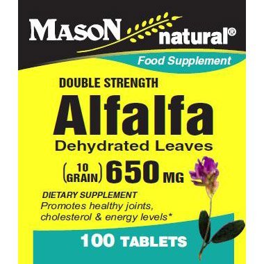 Mason Natural Alfalfa 650 mg Alfalfa Dehydrated Leaves. Double Strength. 10 Grain. Promotes healthy joints, cholesterol & energy levels. Dietary Supplement. Supplement Facts Serving Size 2 Tablets Amount Per Serving % Daily Value Alfalfa (leaf) 1300 mg *