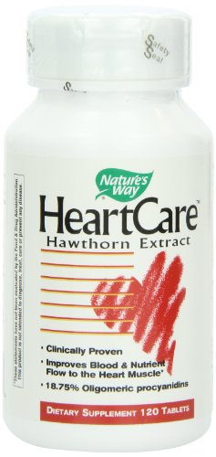 Heart Care (Hawthorn) by Nature's Way 120 Tablet The Unique Hawthorn Extract While many hawthorn extracts contain 2 vitexin extracted from hawthorn berries HeartCare uniquely contains 18.75 oligomeric procyanidins extracted from the herbs potent leaves and flowers. Extracting from this different plant part provides up to 10 times more of the key active bioflavonoids necessary for efficacy. Clinically Proven Validated by over 50 years of clinical research HeartCare has been shown to support efficient heart muscle metabolism by improving its oxygen and energy utilization. Improves blood nutrient flow to the heart muscle. Dosage One tablet twice daily with water. For intense use take up to two tablets three times daily. Best results are obtained with continual use. Dosage Form