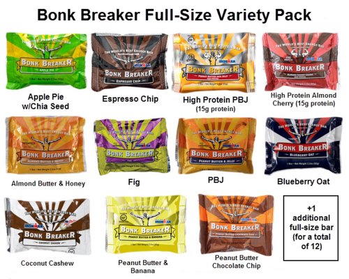 Mixed pack contains 2 High Protein Bars & 10 mixed bonk breaker bars (mixed flavors may vary). Bonk Breaker makes the best-tasting, freshest, and most nutritious energy and protein bars on the planet. All of our bars are gluten & dairy-free and baked fresh weekly. We promise that you will recognize - and be able to pronounce - ALL of our ingredients! Starting with our original PB&J, we've been cooking up great bars in the kitchen for 6 years and we're just getting rolling! From pro athletes to weekend warriors to the perfect addition to a kids lunch pail, we've got a bar for you - fresh out of the oven! Official energy bar of Ironman