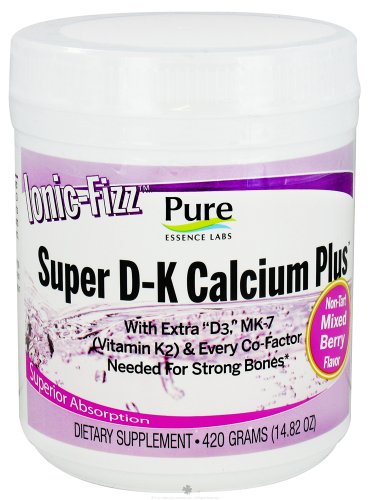 Pure Essence Labs Ionic-Fizz Super D-K Calcium Plus Non-Tart Mixed Berry Flavor - 14.82 oz. (420 grams) Pure Essence Labs Ionic-Fizz Super D-K Calcium Plus is a wonderful product that is identical to Pure Essence Labs' Ionic-Fizz Calcium Plus, except that it provides 1000 IU's of Vitamin D, and also Vitamin K in the body's preferred, menaquinone 7 form. This newly found form of Vitamin K is far more expensive than the phylloquinone form, but is also far more effective in the body. Pure Essence Labs Ionic-Fizz Super D-K Calcium Plus can be used with any of our Vitamin D series products, or with any multiple that does not supply over 5000 IU's of Vitamin D per day. Features & Benefits: 7 Ionic Minerals (Calcium, Magnesium, Boron, Copper, Manganese, Potassium & Zinc) - Most widely recognized mineral forms utilized by the body. The world's best absorbed minerals. Smaller mineral particles increase the rate of absorption. Easily digested, absorbed, and utilized even by those with digestive issues.Vitamin D3 (Cholecalciferol) - Aids in calcium absorption and is vital for healthy bone development. Supports the immune system and longevity. Regulates calcium and phosphorus levels in the blood. Vitamin K2 (Menaquinone 7) - Shown to support bone density when used along with Vitamin D3. The highest quality Vitamin K available and identical to the Vitamin K produced in the large intestines. Ionic Calcium - Requires a much lower amount of calcium to achieve the same benefit that you would see by taking much higher levels of other calcium products. Supports strong bones, teeth, and aids in muscle contractions. Ionic Magnesium - Requires a much lower amount of magnesium to achieve the same benefit that you would see by taking much higher levels of other magnesium products.