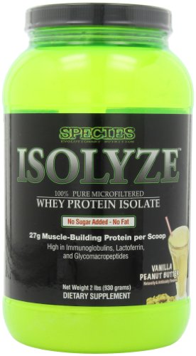 Isolyze is 100% pure, cold-filtered, whey protein isolate. It's the highest yield whey protein available on the market with an amazing 27 grams of protein per 29 gram serving size. ISOLYZE has no carbohydrates, no lactose (milk sugar), and no fat. Its the purest and most biogically available source of whey protein on the planet. At SPECIES, we use a sophisticated cold filtration system that carefully separates out the delicate whey protein without damaging it. This procedure has the added benefit of preserving 3 valuable components of whey immunoglobins, lactoferrins, and glycomacropeptides that are necessary for optimal immune system function and protein synthesis reactions. And if all this werent enough, ISOLYZE tastes great too! Gone are the days of the chemical- or sour-tasting whey isolates! With ISOLYZE, you get the best of both worlds great quality and great taste!