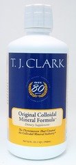Original Colloidal Mineral Formula by T.J. Clark 32fl.oz. Liquid Colloidal minerals provide trace elements missing from modern diets due to modern agricultural practices less than optimal diets and soil depletion. Minerals are needed for the enzymes that are essential for a huge range of the body's needs. When proper balance is restored a startling variety of illness can be helped your specific response will depend on which minerals your body needs most. However research has shown that everyone will benefit from increased nutrient absorption (which increases the goodness' you receive from your food and vitamins and removal of toxic inorganic minerals like metallic aluminium and heavy metals Colloidal Mineral Formula Ingredients Known Essential Minerals Calcium Chloride Cobalt Chromium Magnesium Boron Manganese Molybdenum Selenium Iron Copper Phosphorus Sulphur Potassium Iodine and Zinc aluminium antimony barium boron beryllium bismuth bromine cadmium carbon cerium caesium cobalt dyspr