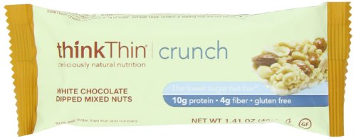 No Sugar • High Protein • Gluten Free thinkThin Crunch White Chocolate Mixed Nuts. Taste the nutty flavors of peanuts, almonds and cashews with a hint of honey and covered with delicious white chocolate for a sweet lower sugar treat for the whole family. With 70% less sugar and80% more protein than leading fruit and nut bars, our crunch bar is a good source of fiber and a naturally delicious snack you can feel good about. |