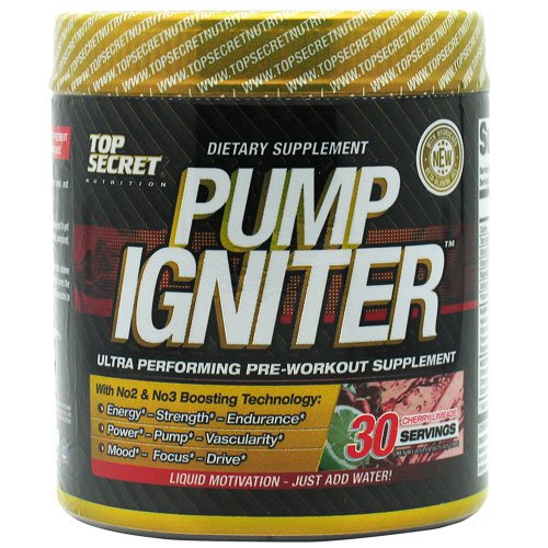 ULTRA PERFORMING PRE-WORKOUT SUPPLEMENT WITH NEW HYDROCARN - BETA-ALANINE HCLIs a true one-of-a-kind pre-workout supplement designed to prime the mind and supercharge the body for outrageous result producing workouts. No2 & No3 BOOSTING TECHNOLOGYPUMP IGNITER is both a pre-workout and intra-workout supplement that is designed to get your butt off the couch, fire you up for a great workout, and keep you motivated, energized, and pumped, so you can get the most out of your time in the gym.HydroCarn is derived from a Carnosyn beta-alanine base that is modified into beta-alanine HCL. It is the next generation in beta-alanine supplementation. With nearly three times the solubility of Carnosyn Beta-alanine, HydroCran is rapidly absorbed into the muscles to boost performance. TOP SECRET NUTRITION'S PUMP IGNITERIs literally liquid motivation - just add water! PUMP IGNITER is formulated to help boost your:Drive Power Pump Energy Endurance Focus Mood