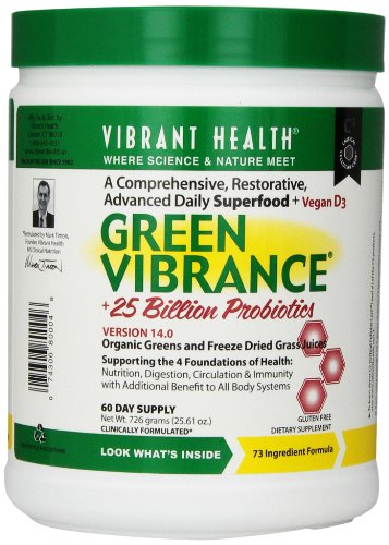 Green Vibrance is the original Concentrated Green Superfood. It's a nutritional powerhouse that improves energy and endurance, strengthens immunity, improves digestion and circulation. Green Vibrance has more nutrient density than any other green-food product on the market. It contains 58 certified organic, concetrated foods and extracts, all of the highest quality, along with an industry-leading 18 billion probiotics per serving.